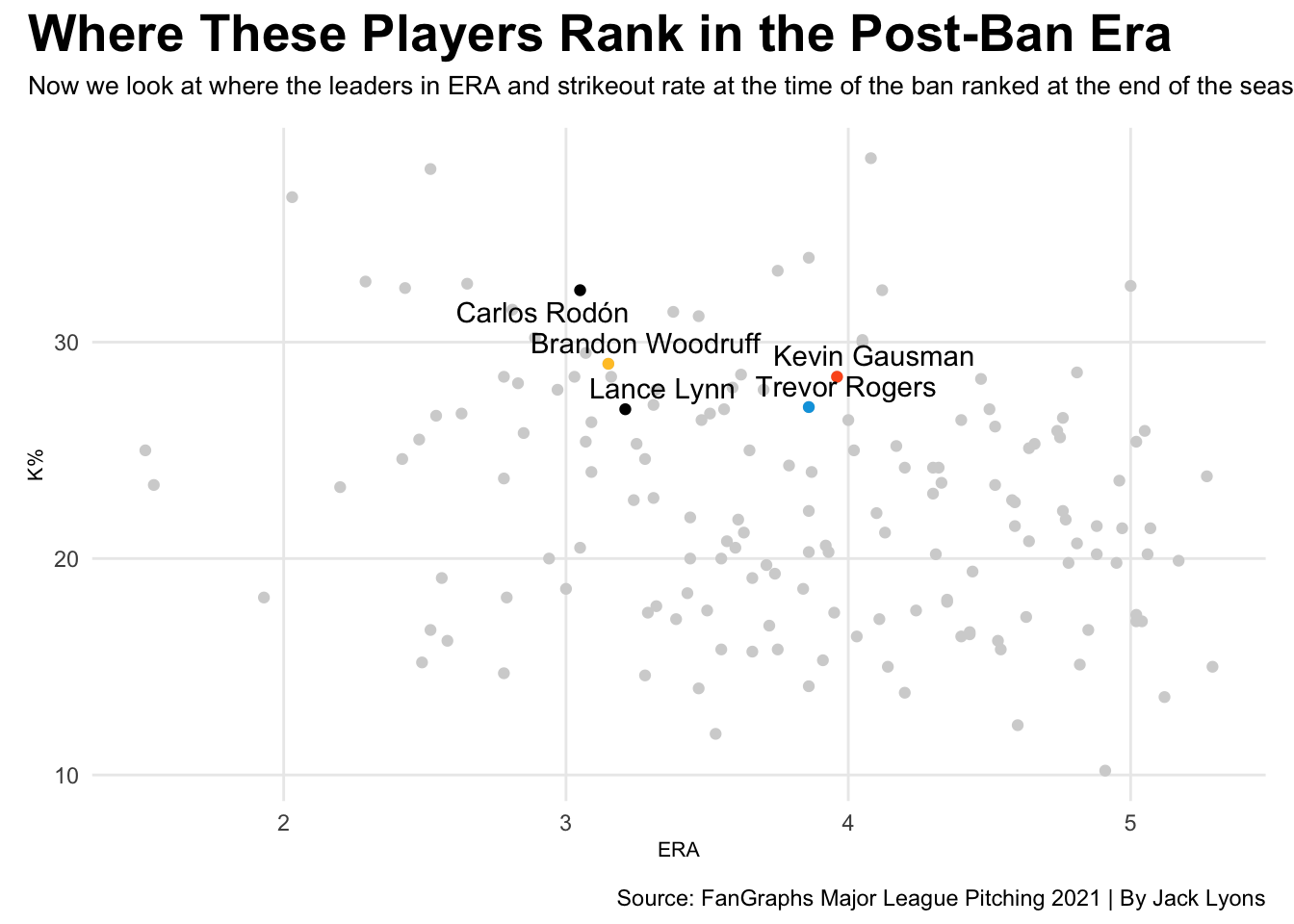 newpost <- postera |>filter(ERA <5.3)newbw <- postera |>filter(Name =="Brandon Woodruff")newcr <- postera |>filter(Name =="Carlos Rodón")newkg <- postera |>filter(Name =="Kevin Gausman")newll <- postera |>filter(Name =="Lance Lynn")newtr <- postera |>filter(Name =="Trevor Rogers")ggplot() +geom_point(data=newpost, aes(x= ERA, y=`K%`), color="lightgrey")+geom_point(data=newbw, aes(x= ERA, y=`K%`), color="#FFC52F")+geom_point(data=newcr, aes(x= ERA, y=`K%`), color="black")+geom_point(data=newkg, aes(x= ERA, y=`K%`), color="#FD5A1E")+geom_point(data=newll, aes(x= ERA, y=`K%`), color="black")+geom_point(data=newtr, aes(x= ERA, y=`K%`), color="#00A3E0")+geom_text_repel(data=newbw, aes(x=ERA, y=`K%`, group=Team, label="Brandon Woodruff" )) +geom_text_repel(data=newcr, aes(x=ERA, y=`K%`, label="Carlos Rodón" )) +geom_text_repel(data=newkg, aes(x=ERA, y=`K%`, label="Kevin Gausman" )) +geom_text_repel(data=newll, aes(x=ERA, y=`K%`, label="Lance Lynn" )) +geom_text_repel(data=newtr, aes(x=ERA, y=`K%`, label="Trevor Rogers" )) +theme_minimal() +theme(plot.title =element_text(size =20, face ="bold"),axis.title =element_text(size =8), plot.subtitle =element_text(size=10), panel.grid.minor =element_blank() ) +plot_annotation(title ="Where These Players Rank in the Post-Ban Era",subtitle ="Now we look at where the leaders in ERA and strikeout rate at the time of the ban ranked at the end of the season.",caption ="Source: FanGraphs Major League Pitching 2021 | By Jack Lyons" ) &theme(plot.title =element_text(size =20, face ="bold"),axis.title =element_text(size =8), plot.subtitle =element_text(size=10), panel.grid.minor =element_blank() )
